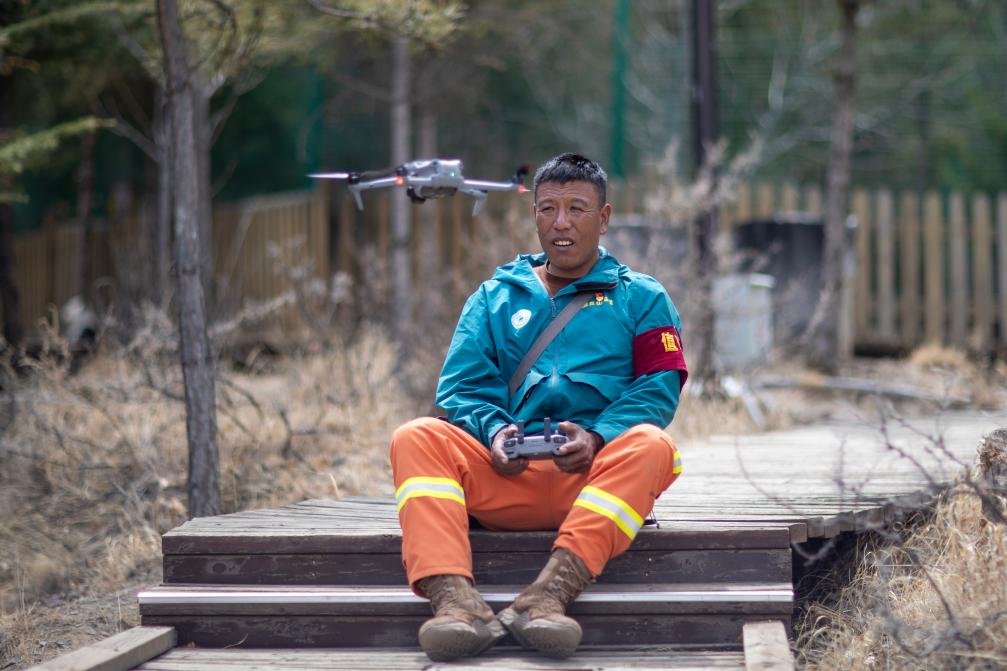 拉薩南山公園園區(qū)護(hù)林員扎西曲培正在操控?zé)o人機(jī)(3月20日攝)。新華社記者姜帆 攝