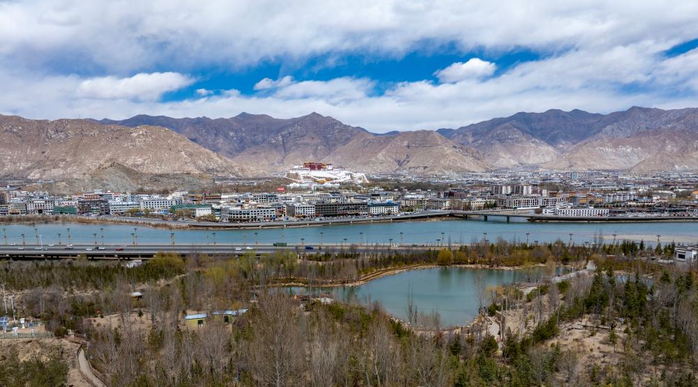 拉薩坐落于狹長(zhǎng)的河谷地帶,拉薩河蜿蜒穿城,兩岸南山與北山連綿起伏。在布達(dá)拉宮正南方,綠色的南山與市區(qū)隔河相望,山間灌木與喬木錯(cuò)落有致,綠意盎然。