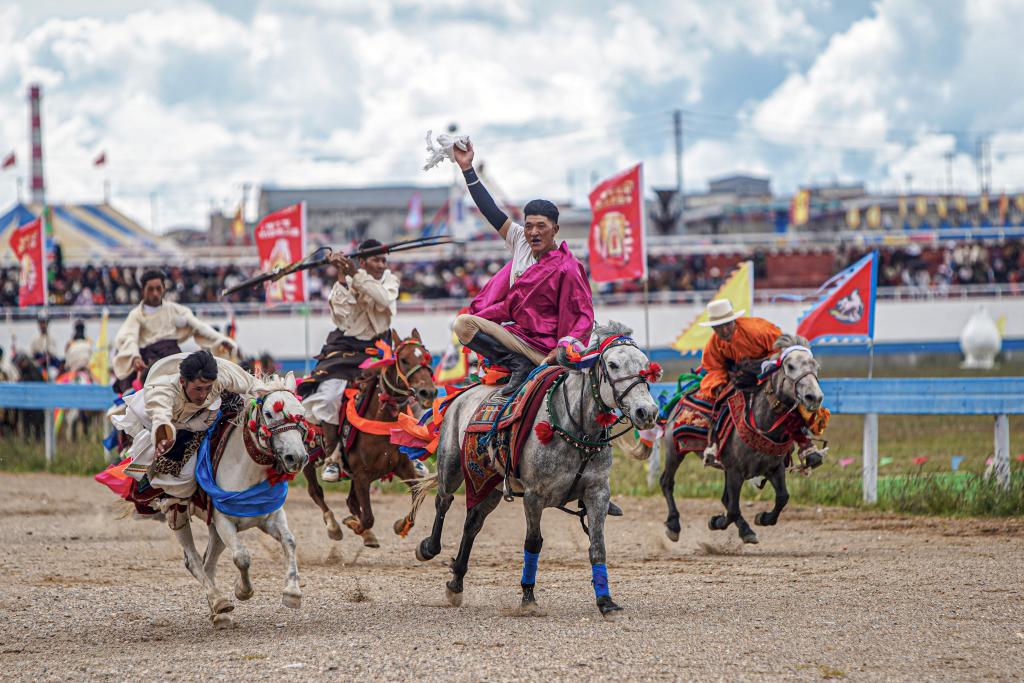 2023年8月10日,騎手在那曲市恰青賽馬節(jié)開幕式上進(jìn)行馬術(shù)表演。新華社記者邵澤東攝