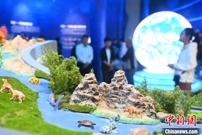 6月16日,在位于甘肅省張掖市肅南裕固族自治縣的祁連山國(guó)家公園自然博物館內(nèi),游人參觀(guān)祁連山動(dòng)植物演化沙盤(pán)模型。中新社記者 李亞龍 攝