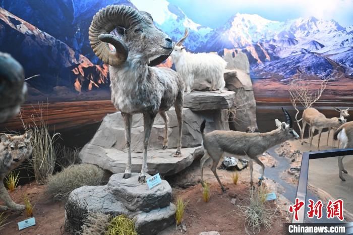 6月16日,在位于甘肅省張掖市肅南裕固族自治縣的祁連山國(guó)家公園自然博物館展陳的西藏盤(pán)羊標(biāo)本。中新社記者 李亞龍 攝