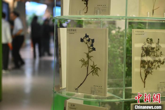 6月16日,在位于甘肅省張掖市肅南裕固族自治縣的祁連山國(guó)家公園自然博物館展陳的川甘翠雀花標(biāo)本與紅花巖生忍冬標(biāo)本。中新社記者 李亞龍 攝