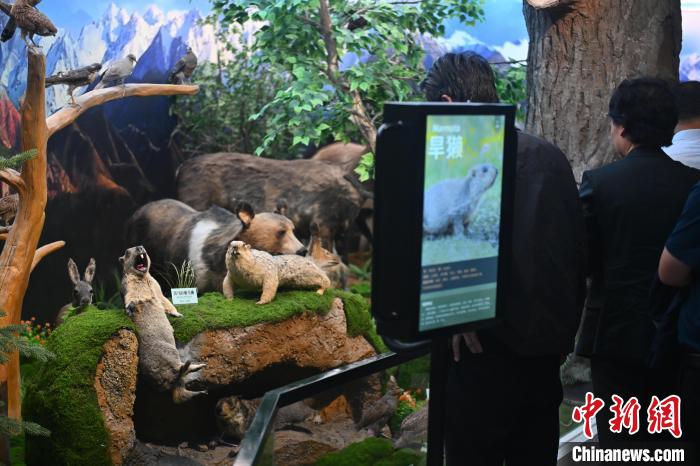 6月16日,在位于甘肅省張掖市肅南裕固族自治縣的祁連山國(guó)家公園自然博物館內(nèi),游人參觀(guān)喜馬拉雅旱獺標(biāo)本。中新社記者 李亞龍 攝
