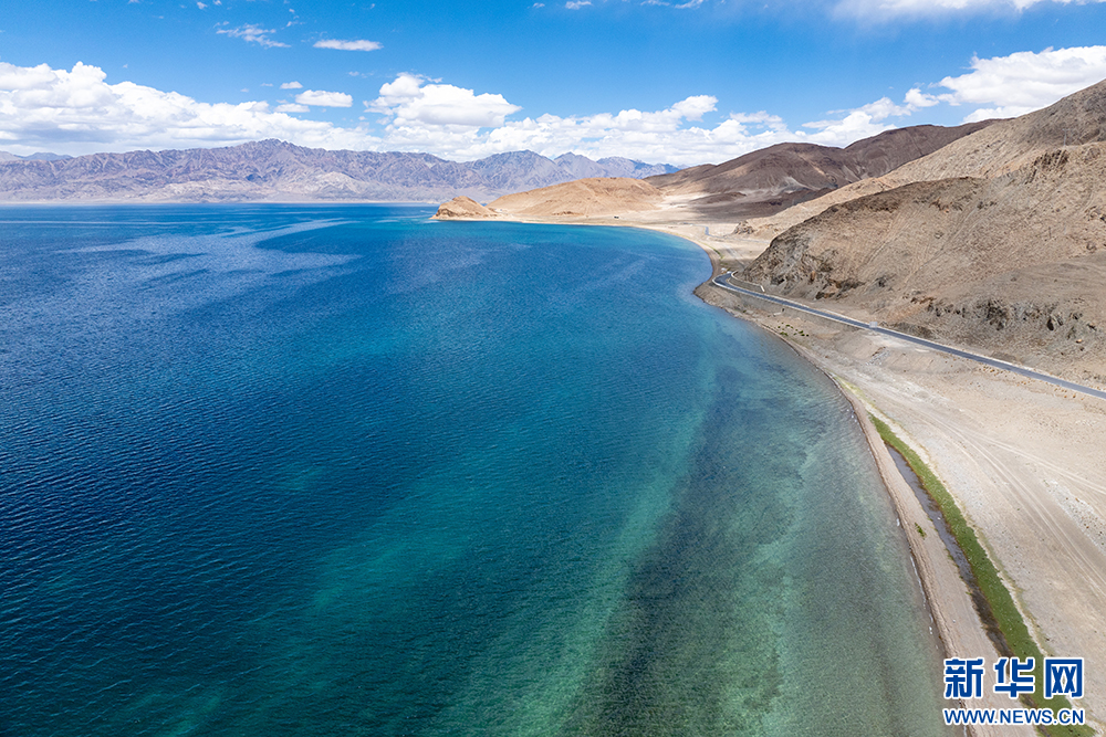 藍(lán)天白云映襯下的班公湖(6月15日攝,無人機照片)。新華網(wǎng) 旦增努布 攝