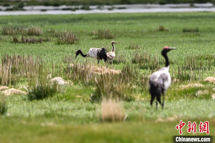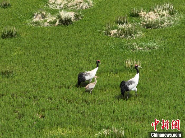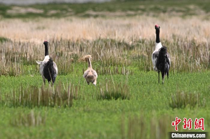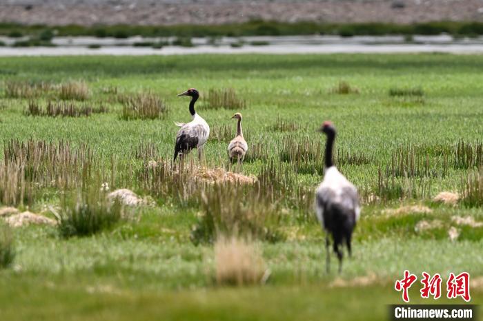 7月10日,在海拔4700米的西藏自治區(qū)那曲市申扎縣濕地里,黑頸鶴一家在悠閑覓食。黑頸鶴是中國(guó)國(guó)家一級(jí)重點(diǎn)保護(hù)野生動(dòng)物,屬高原特有鶴類,主要棲息于海拔2500米至5000米的高原沼澤地、湖泊及河灘等濕地環(huán)境。每年四月起,成對(duì)的黑頸鶴陸續(xù)飛抵西藏自治區(qū)那曲市申扎縣,在此繁育后代。近年來,申扎縣持續(xù)加強(qiáng)生態(tài)修復(fù),濕地面積擴(kuò)大、水質(zhì)改善,為黑頸鶴等珍稀物種提供了理想家園。中新社發(fā) 毛建軍 攝