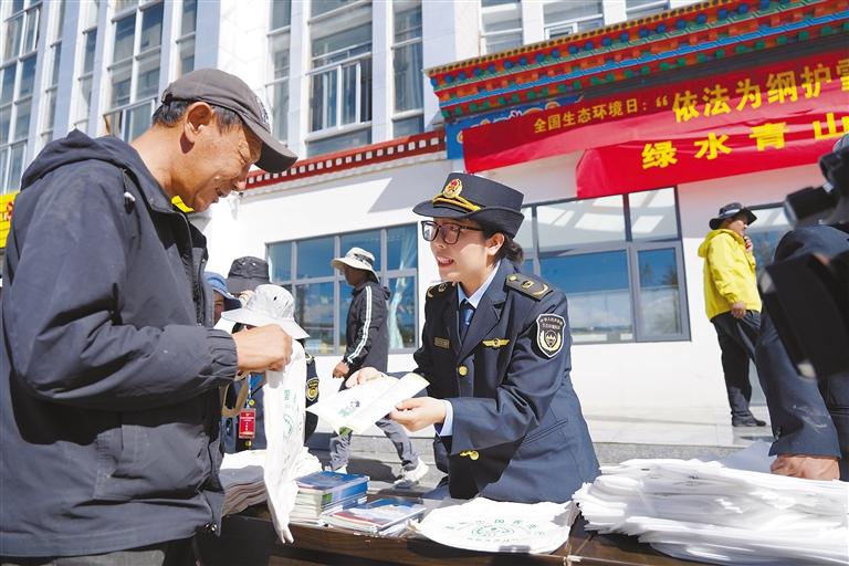 在法規(guī)宣講環(huán)節(jié),工作人員通過設(shè)立宣傳展板、懸掛宣傳橫幅、發(fā)放政策法規(guī)手冊、現(xiàn)場接受群眾咨詢答疑等形式,向群眾集中宣傳《中華人民共和國青藏高原生態(tài)保護(hù)法》及自治區(qū)實(shí)施辦法等生態(tài)環(huán)保法律法規(guī)。