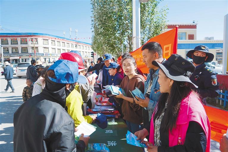圖為那曲市索縣各普法成員單位工作人員為過往群眾發(fā)放生態(tài)環(huán)保相關(guān)宣傳資料。通訊員 益西卓嘎 攝