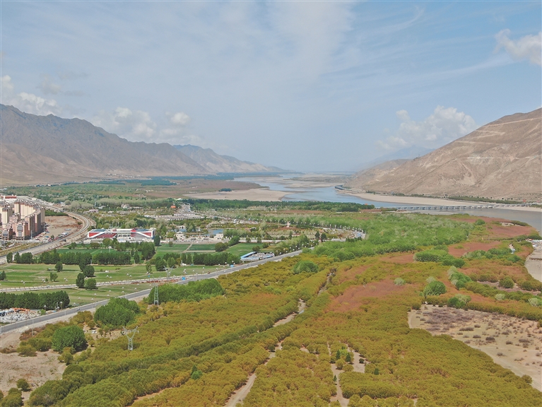 圖為臨近山南市區(qū)的雅魯藏布江沿岸綠意蔥蘢的人造林(資料圖片)。 記者 巴桑旺姆 攝
