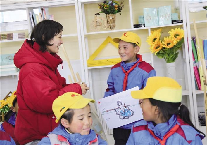 美術(shù)教室布置之初,從一年級(jí)到六年級(jí),二三十名學(xué)生追到新教室,拿著彩筆在墻上畫出一幅幅稚嫩卻充滿童趣的圖畫?!拔蚁氘嬕粋€(gè)城堡,給它圖上美麗的顏色!”“我要把牦牛畫在墻上?!薄拔乙媯€(gè)飛行員”……