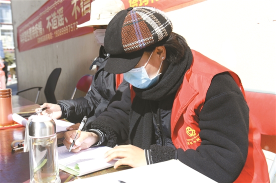為大學(xué)生志愿者次仁措姆在塔瑪小區(qū)門口幫小區(qū)物業(yè)登記出入人員信息。(本組圖片由拉薩融媒視覺組攝)