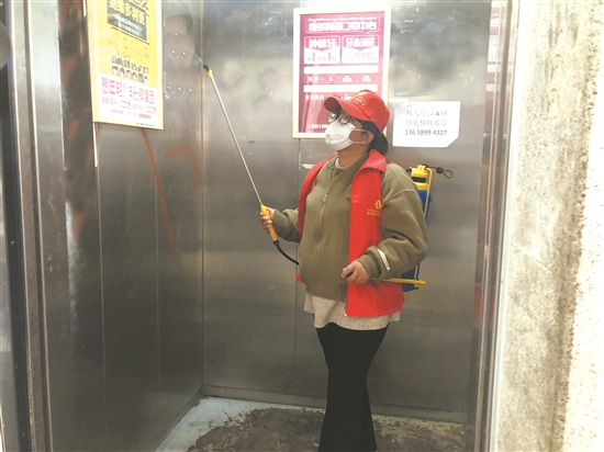 為大學(xué)生志愿者拉姆在城關(guān)花園A區(qū)電梯內(nèi)噴灑消毒液。(本組圖片由拉薩融媒視覺組攝)