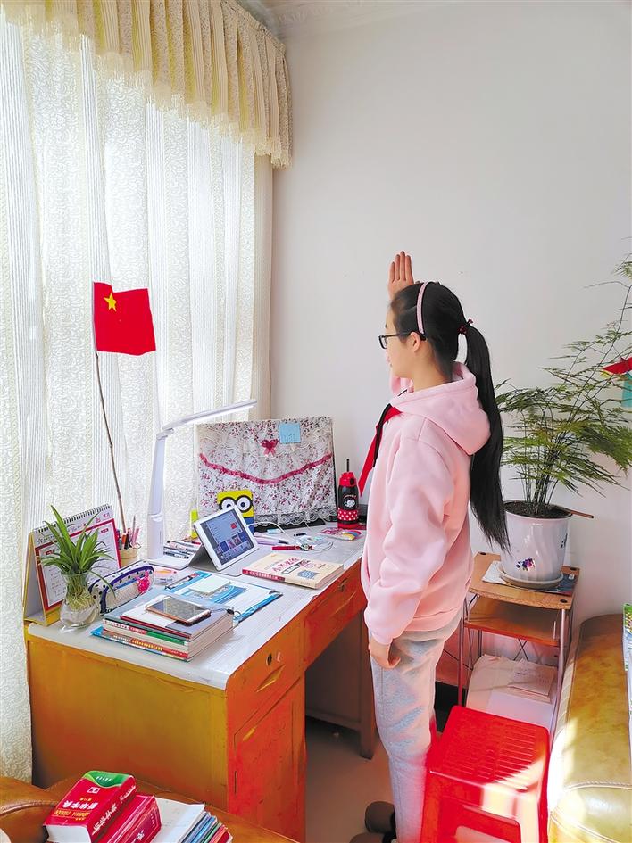 圖為3月3日,拉薩一小的學(xué)生在家參加線上升國旗儀式。 記者 周科 通訊員 侯俊 攝