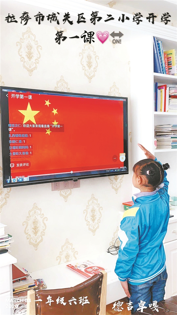 整潔的書桌上擺放著嶄新的教材,穿上干凈的校服、系好鮮艷的紅領(lǐng)巾,西藏拉薩市城關(guān)區(qū)第二小學(xué)的學(xué)生鄭重地舉起右手向電視屏幕里的國(guó)旗敬禮。隨后,教師在線上為學(xué)生進(jìn)行授課,而孩子們也在家里開啟了新的上課模式,聽課、記筆記、寫作業(yè)、背書……