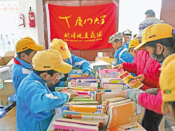 圖為廈門(mén)大學(xué)竹蜻蜓支教隊(duì)在當(dāng)雄縣龍仁鄉(xiāng)中心小學(xué)舉辦流動(dòng)圖書(shū)館活動(dòng)。通訊員 黃宇霞 高捷 何春雨 崔慶煒