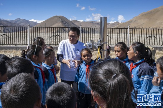 5月23日,工作人員為參加“公眾科學(xué)日”活動的學(xué)生介紹珠峰站內(nèi)的科研設(shè)備。新華社記者 普布扎西 攝