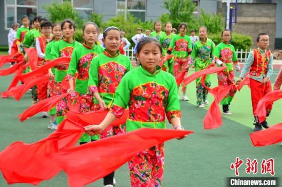 圖為化隆縣第一小學(xué)的學(xué)生們正在跳《民族大團結(jié)》(左前一是李貴蘭)?!◆?shù)り?攝
