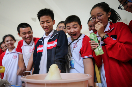 10月26日,北京師范大學(xué)海口附屬學(xué)校的學(xué)生參與化學(xué)趣味實(shí)驗(yàn)。當(dāng)日,北京師范大學(xué)??诟綄賹W(xué)校舉行第三屆科技人文節(jié)活動(dòng),在校內(nèi)營造愛科學(xué)、學(xué)科學(xué)的良好氛圍。