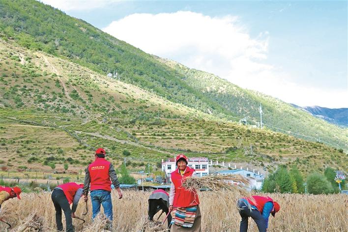 圖為朗縣拉多鄉(xiāng)新時代文明實踐巾幗志愿服務(wù)隊的隊員們正在幫助村民收割青稞。胡照躍 攝
