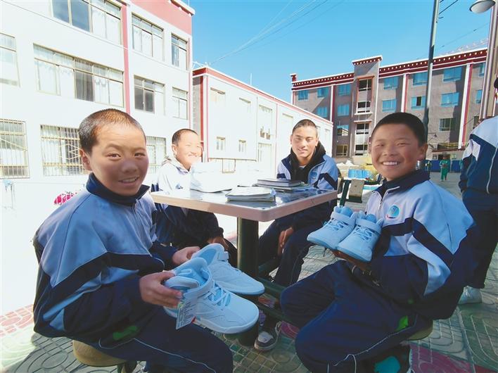 領到運動鞋的學生們開心不已。扎西頓珠 攝