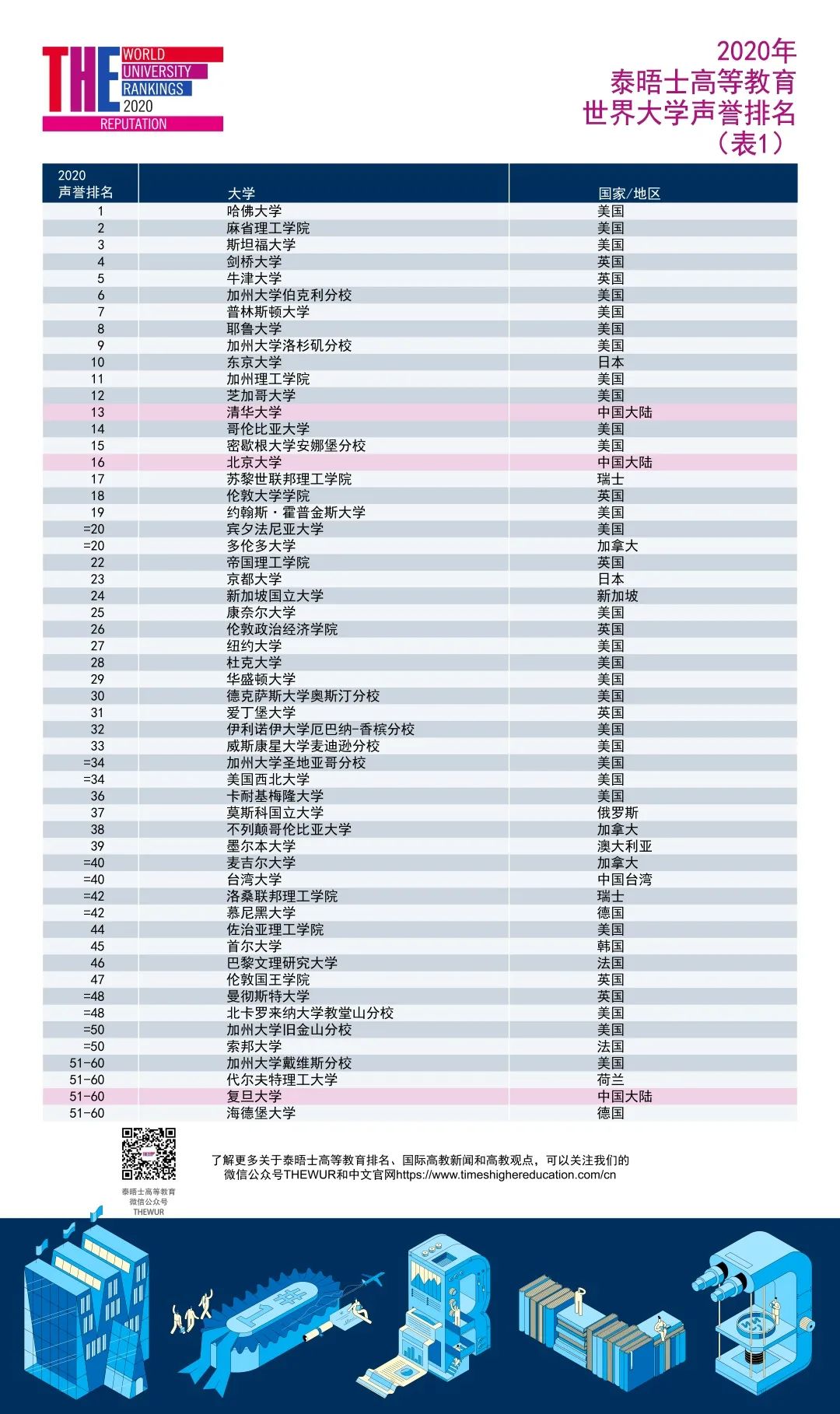 泰晤士高等教育發(fā)布2020年大學(xué)聲譽排名,清北位列世界前20