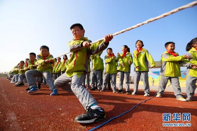 11月12日,學生在大課間參加拔河比賽。 位于山東省青島市即墨區(qū)的青島藍谷高新區(qū)東皋埠小學是一所鄉(xiāng)村學校,近年來,學校開展以乒乓球、籃球、跳繩等運動為主的大課間活動,讓孩子們在享受運動的同時愉悅身心,增強體質(zhì)。 新華社發(fā)(梁孝鵬攝)