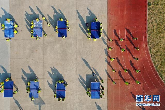 11月12日,學生在大課間打乒乓球(無人機照片)。 位于山東省青島市即墨區(qū)的青島藍谷高新區(qū)東皋埠小學是一所鄉(xiāng)村學校,近年來,學校開展以乒乓球、籃球、跳繩等運動為主的大課間活動,讓孩子們在享受運動的同時愉悅身心,增強體質(zhì)。 新華社發(fā)(梁孝鵬攝)