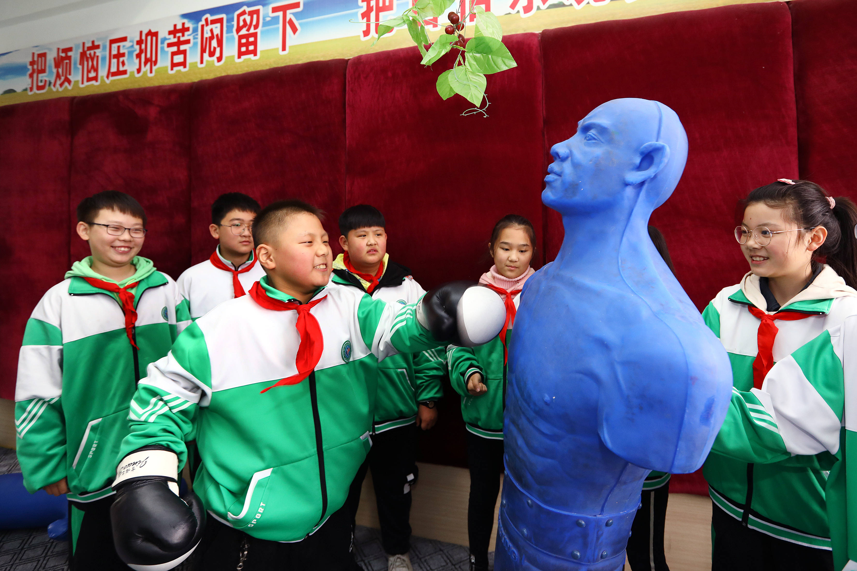 11月15日,安徽省淮北市的小學生在相山區(qū)未成年人心理健康輔導站宣泄室擊打橡皮人。