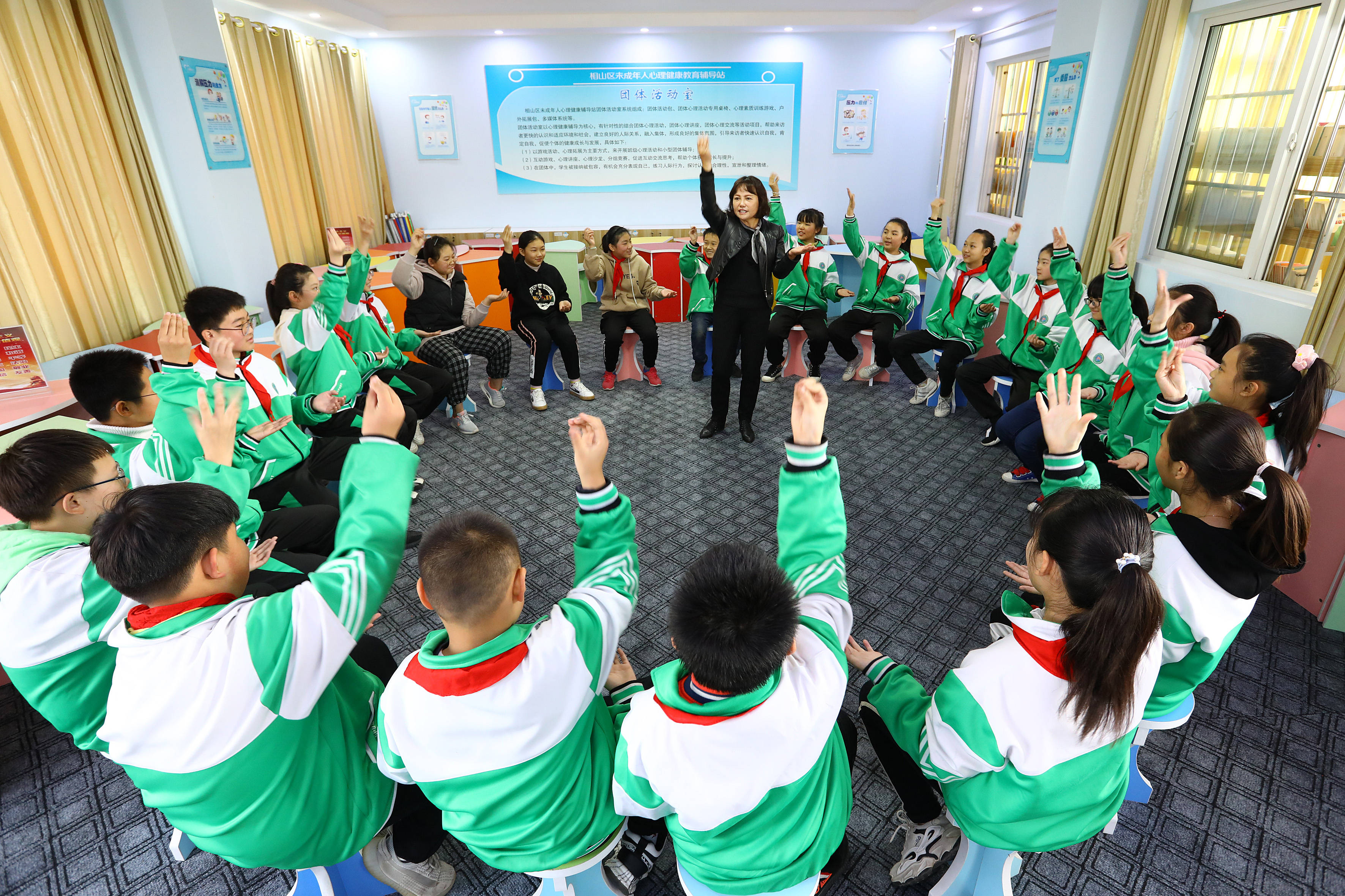 11月15日,淮北市的小學生在相山區(qū)未成年人心理健康輔導站音樂室聽音樂放松身心。
