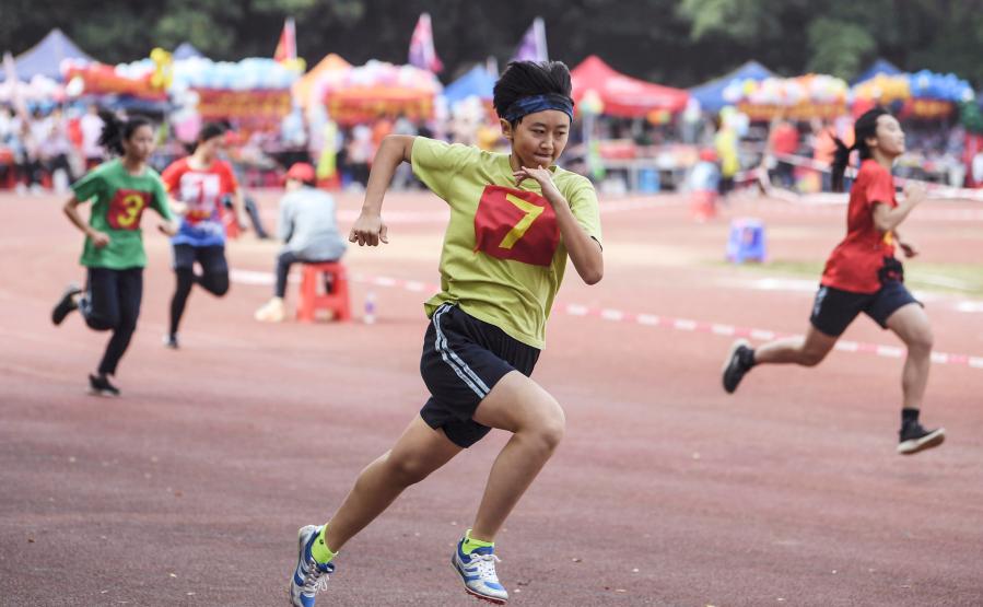 11月26日, 廣西大學(xué)附屬中學(xué)初中年級(jí)學(xué)生在200米跑比賽中。新華社記者張愛(ài)林?jǐn)z