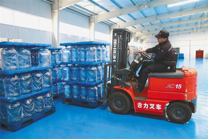圖為在山南市雅礱天然飲品公司,當(dāng)?shù)卮迕翊稳蕷W珠正搬運(yùn)大桶水。 本報(bào)記者次珍攝