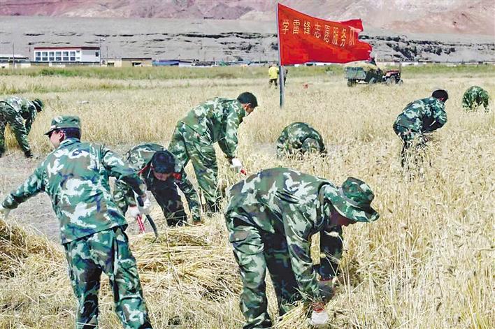 圖為駐地部隊組建“學雷鋒志愿服務(wù)隊”幫助烏江村村民秋收。