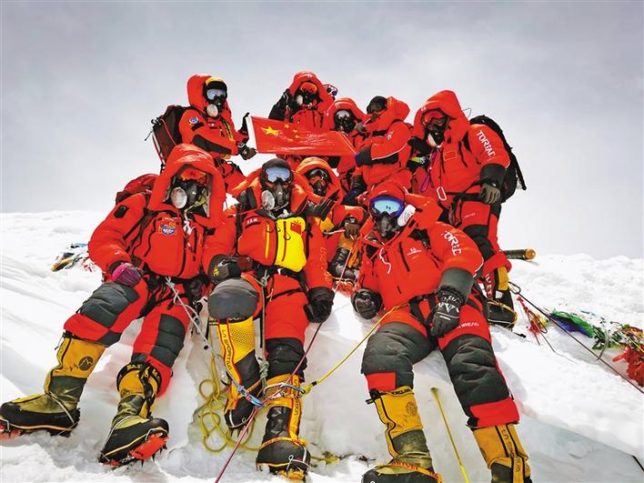 5月27日,2020珠峰高程測量登山隊成功登頂世界第一高峰珠穆朗瑪峰。他們在峰頂豎立覘標(biāo),安裝GNSS天線,開展各項峰頂測量工作。45年前的這一天,中國人首次將覘標(biāo)帶至珠峰峰頂。新華社特約記者 扎西次仁 攝