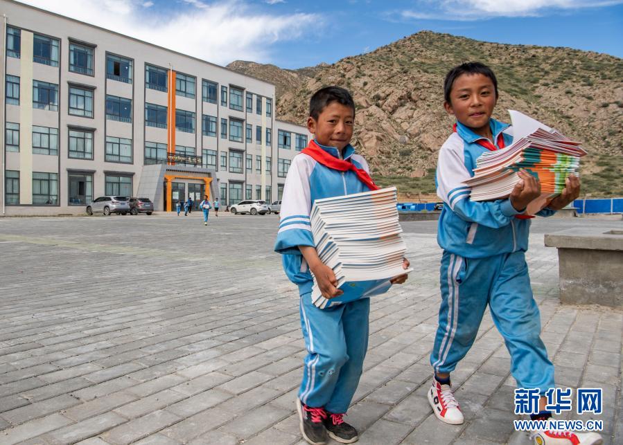 在山南市貢嘎縣森布日幸福家園九年一貫制學校,剛開學的孩子們搬新書(8月24日攝)。新華社記者 孫非 攝