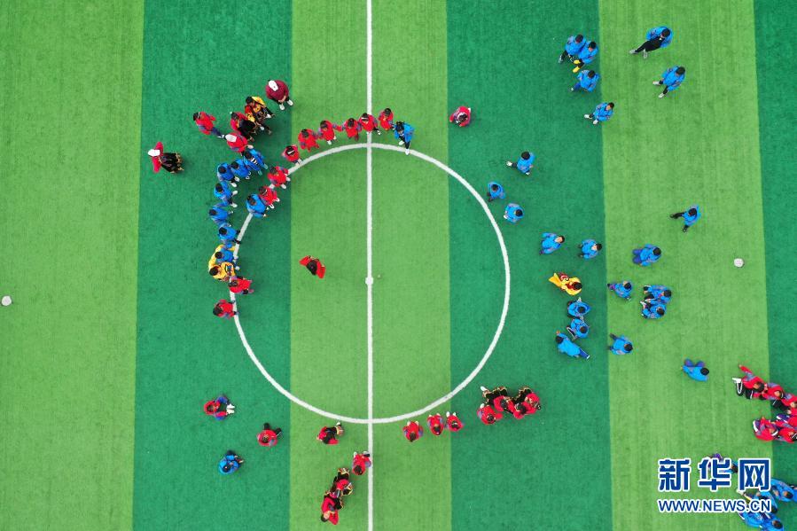 在西藏林芝市波密縣多吉鄉(xiāng)中心小學,學生們在學習西藏自治區(qū)級非遺項目“波央”的歷史(10月13日攝,無人機照片)。新華社記者 詹彥 攝