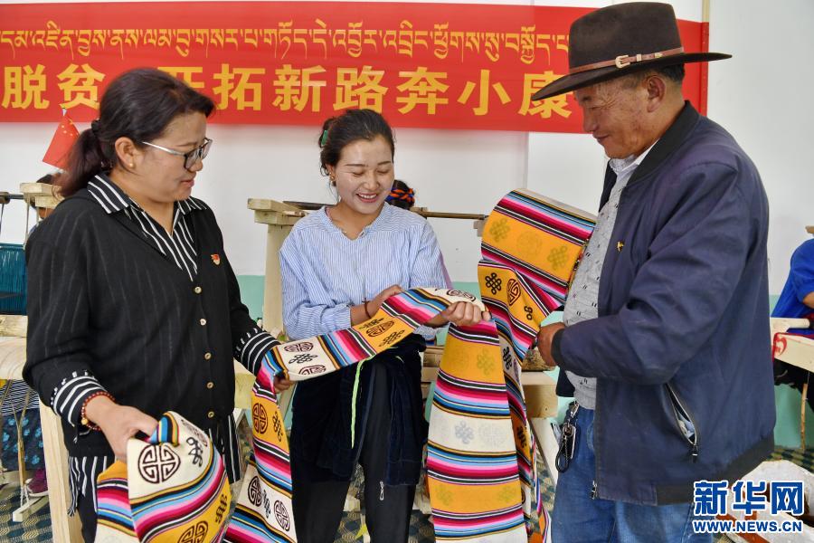 搬遷到日喀則市拉孜縣拉孜鎮(zhèn)新村的村民卓拉,經(jīng)過技能培訓(xùn)找到了一份編制氆氌的工作,一年有5000多元收入。她說: