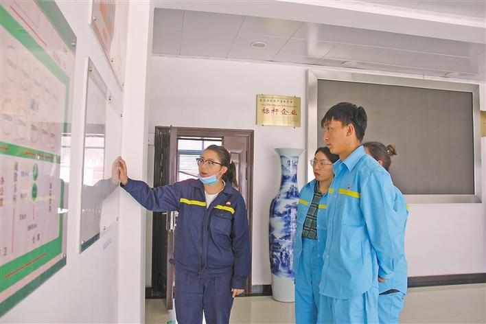 圖為鐵路接卸油庫青年員工索娜曲珍為新入職員工講解油庫工藝流程。李一蕾 唐啟勝 攝