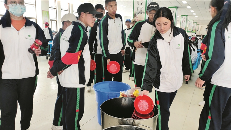 中午13時,在拉薩北京實驗中學食堂里,學生有序排隊取餐,根據“吃多少拿多少”的原則進行點餐。用餐結束后,學生排隊放置碗筷,記者注意到,大多數學生用過的餐碗非常干凈,沒有浪費主食的情況,用來裝食物殘渣的泔水桶里并沒有多少被倒掉的殘羹剩飯。