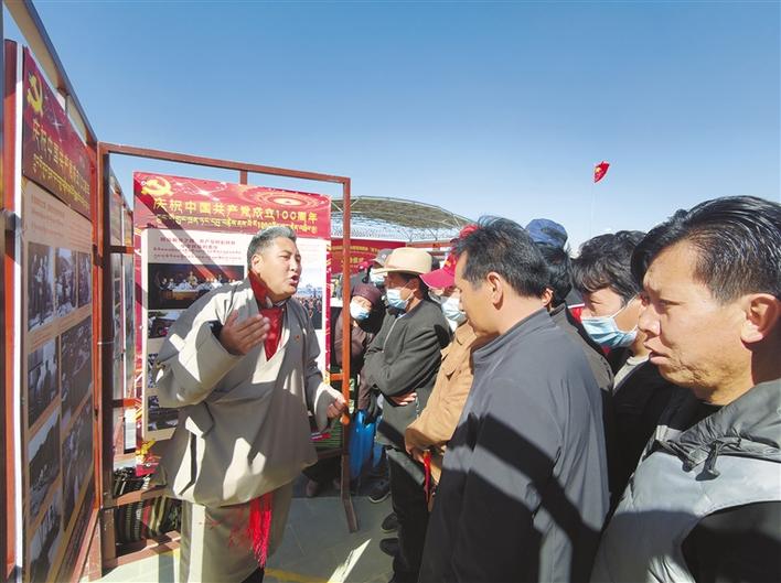 圖為在桑珠孜區(qū)甲措雄鄉(xiāng)文化廣場(chǎng),宣講員結(jié)合展板圖文內(nèi)容開(kāi)展黨史學(xué)習(xí)教育宣講。汪純 攝