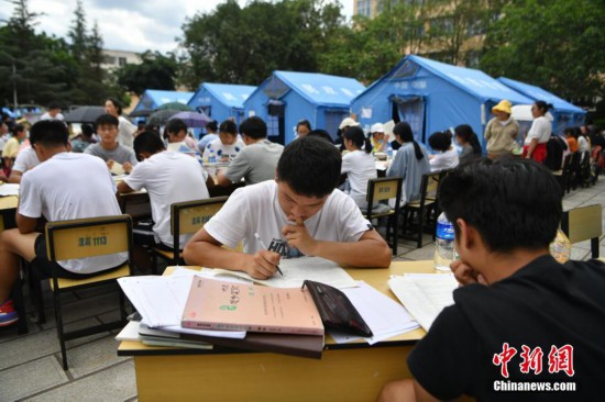 5月22日,云南省大理州漾濞縣漾濞一中的高三學(xué)生在露天“教室”備戰(zhàn)高考。5月21日,當(dāng)?shù)剡B發(fā)多次地震,最高6.4級。 中新社記者 劉冉陽 攝