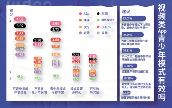 面對(duì)目前各平臺(tái)青少年模式良莠不齊的現(xiàn)狀,參與測(cè)評(píng)的大學(xué)生也有自己的見(jiàn)解。在剛剛畢業(yè)1年的95后教師姜煒眼里,部分軟件青少年模式下推薦的內(nèi)容不能滿足青少年的興趣?!昂每匆曨l給我推薦的都是動(dòng)畫(huà)片,我教的高中生不太感興趣;小紅書(shū)的青少年模式入口有點(diǎn)難找,找到以后推薦給我的都是考研相關(guān)內(nèi)容,對(duì)未成年人來(lái)說(shuō)可讀性不高;斗魚(yú)、虎牙這類(lèi)直播平臺(tái),本身大部分都是游戲類(lèi)內(nèi)容,青少年模式下幾乎大多數(shù)內(nèi)容都會(huì)被屏蔽,我相信任何使用這兩款軟件的青少年都不愿意使用青少年模式?!辈贿^(guò),他給抖音和B站打了高分?!斑@兩款軟件的推送內(nèi)容除了有興趣類(lèi)的,還有一些名師課程,符合青少年的興趣?!?/p>