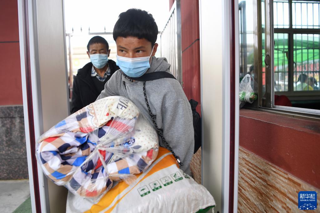 碌曲縣藏族中學(xué)高一新生帶著行李通過測(cè)溫門到學(xué)校報(bào)到(8月30日攝)。新華社記者 陳斌 攝