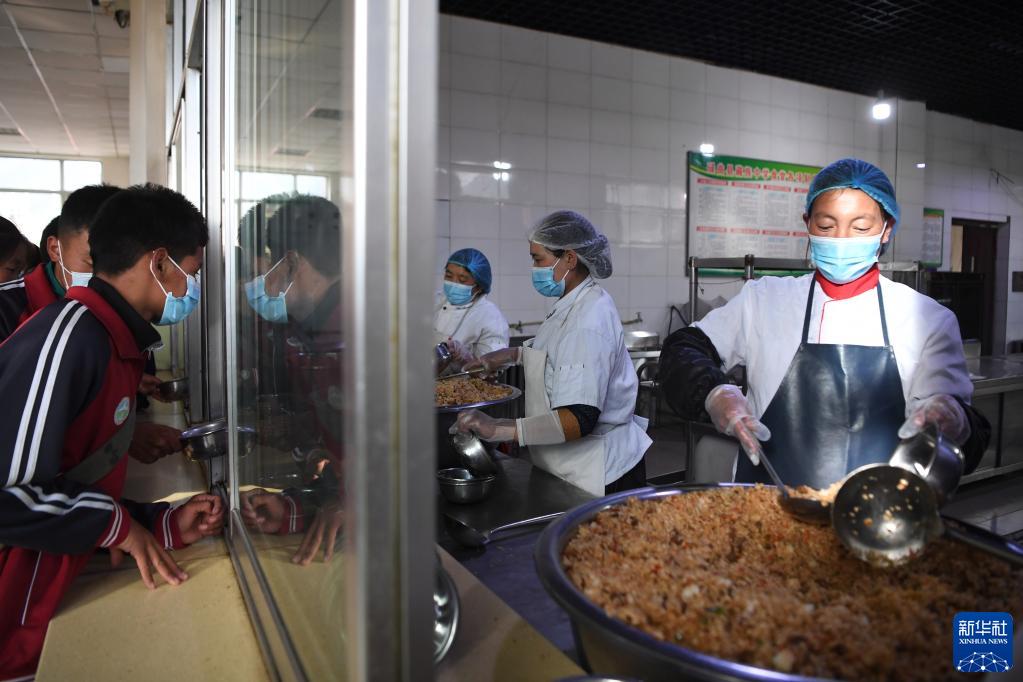 碌曲縣藏族中學(xué)的學(xué)生在食堂打飯(8月30日攝)。新華社記者 陳斌 攝