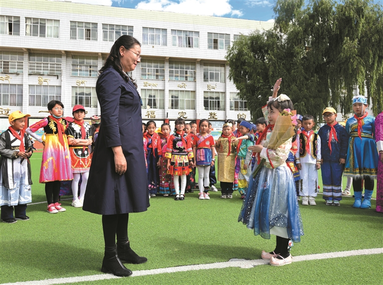 拉薩市第一小學(xué)的孩子身著節(jié)日盛裝,向老師敬獻(xiàn)鮮花。