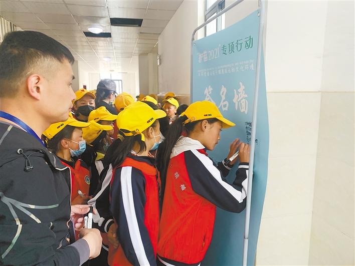 學(xué)生在“護苗2021”專項行動簽名墻上簽名。記者 張宇 攝