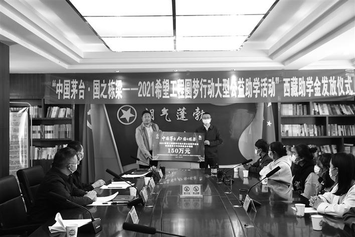 10月25日,共青團(tuán)西藏自治區(qū)委員會(huì)、西藏青少年發(fā)展基金會(huì)和貴州茅臺(tái)酒廠(集團(tuán))有限責(zé)任公司在拉薩舉行“中國(guó)茅臺(tái)·國(guó)之棟梁”2021希望工程圓夢(mèng)行動(dòng)大型公益助學(xué)活動(dòng)西藏助學(xué)金發(fā)放儀式。