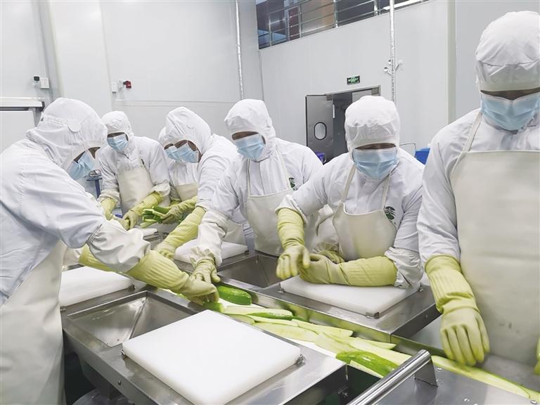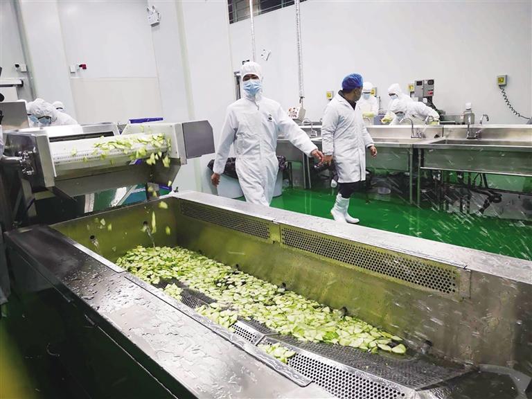 通過員工通道,在該廚房生產(chǎn)廠長甘文忠的指導(dǎo)下,記者穿上了白色工作服、戴上食品安全帽,換上高筒膠鞋,洗手消毒、測量體溫、隨身攜帶的手機(jī)、首飾全部摘掉后,通過腳踏池進(jìn)入生產(chǎn)加工車間。