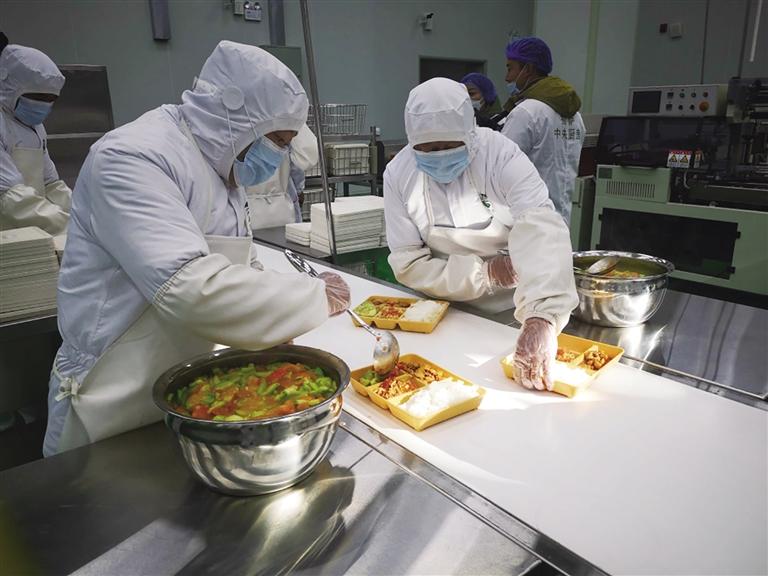這些凈菜準(zhǔn)備好后,通過設(shè)備轉(zhuǎn)運(yùn)至熱菜烹炒車間,在這里有幾位廚師正在烹飪宮保雞丁、西紅柿炒蛋、青菜西紅柿湯等。這些凈菜經(jīng)過加工之后被運(yùn)送至分餐車間。餐盒經(jīng)高溫消毒后,工作人員將每一份米飯、熱菜取樣留存,然后開始分工分餐,打包好的餐盒通過加溫消毒后,裝進(jìn)保溫箱,運(yùn)送至配餐車內(nèi)。