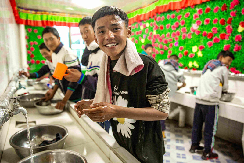 走進(jìn)薩迦中學(xué)新投入使用的女生宿舍樓,可以看到每個房間門口都布置了信息欄,詳細(xì)介紹了入住學(xué)生信息、室長和帶教老師信息;門口統(tǒng)一配備鞋架,孩子們在門口換好鞋再進(jìn)房間,保持了室內(nèi)地面的清潔。室內(nèi)外隔間是統(tǒng)一的儲物柜,存放學(xué)生私人用品;內(nèi)間是整整齊齊8個上下鋪位,中間合用的臺子上牙刷、水杯整齊劃一擺放;靠窗有統(tǒng)一的臉盆架;每個樓層都有3處盥洗室。由于縣中學(xué)內(nèi)沒有學(xué)生浴室,新宿舍盥洗室內(nèi)還特地安裝了電加熱的恒溫暖水設(shè)備。入冬后,薩迦中學(xué)的孩子們終于能夠在宿舍洗漱時用上熱水了。