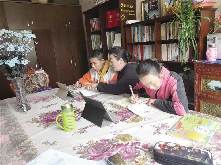 中國拉薩SOS兒童村的媽媽為孩子輔導作業(yè)。記者 王靜 攝