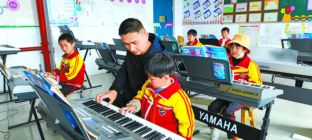 “我會教他們認(rèn)樂譜、怎么卡節(jié)奏、唱什么聲部,經(jīng)過長期堅(jiān)持學(xué)習(xí),孩子們進(jìn)步很快?!敝艿猛呏笇?dǎo)學(xué)生彈奏電子琴的指法,邊笑著和我們聊到,自從2017年,學(xué)校配備了專門的音樂教室,每堂課他都會堅(jiān)持使用樂器,以此來培養(yǎng)孩子們的音樂素養(yǎng),效果非常不錯。